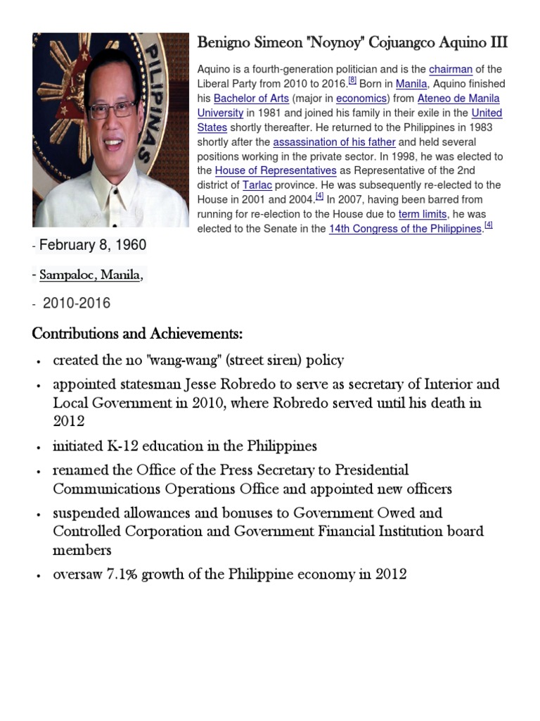 1 ağustos 2009 tarihinde annesinin ölümünden sonra birçok kişi başkanlığa aday olması için aquino'ya çağrıda bulunmaya başladı. Benigno aquino iii is a member of. Benigno simeon cojuangco aquino iii is the 15th president of the philippines. Born in manila, aquino graduated from ateneo de manila university in 1981 and joined his family in their exile in the united states shortly thereafter. Former president benigno noynoy aquino iii has died, according to a report on super radyo dzbb on thursday, citing sources. Philippine history benigno aquino iii: Personal freedom and independence are very important to benigno and he resists being owned or dictated to. President benigno 'noynoy' aquino iii is the 15th president of the philippines. If you're interested to discover more about philippines greatest president benigno aquino iii achievements, you can visit: Since the start of his presidency, he has also been referred to in the media as pnoy. Aquino, son of the late president corazon aquino and slain senator benigno ninoy aquino jr., was earlier rushed to the capitol medical center in quezon city, reports. Presidents of the philippines and their achievements and contributions. This biography profiles his childhood, life, political career, achievements and timeline.